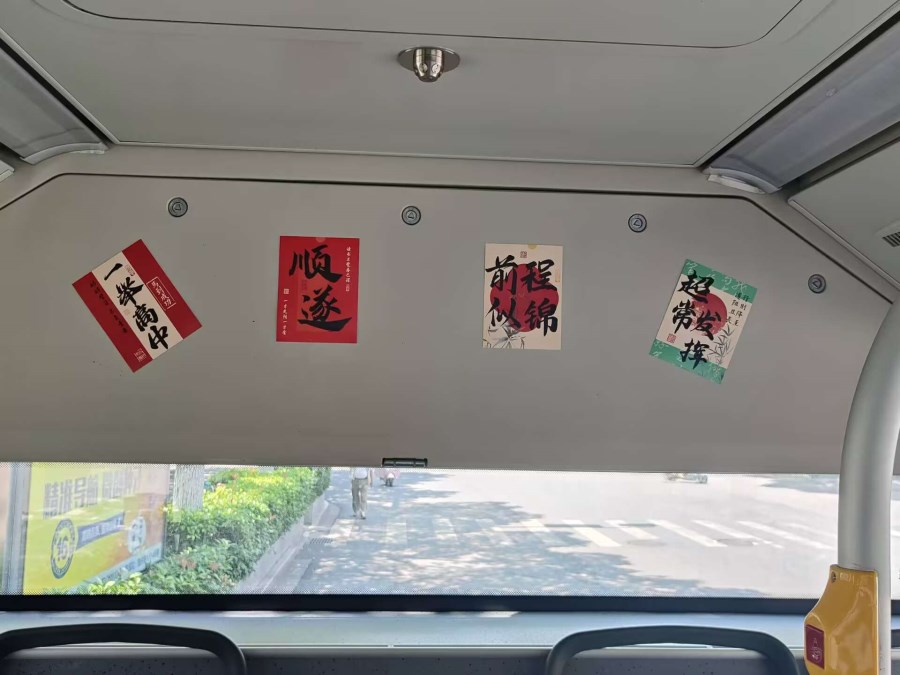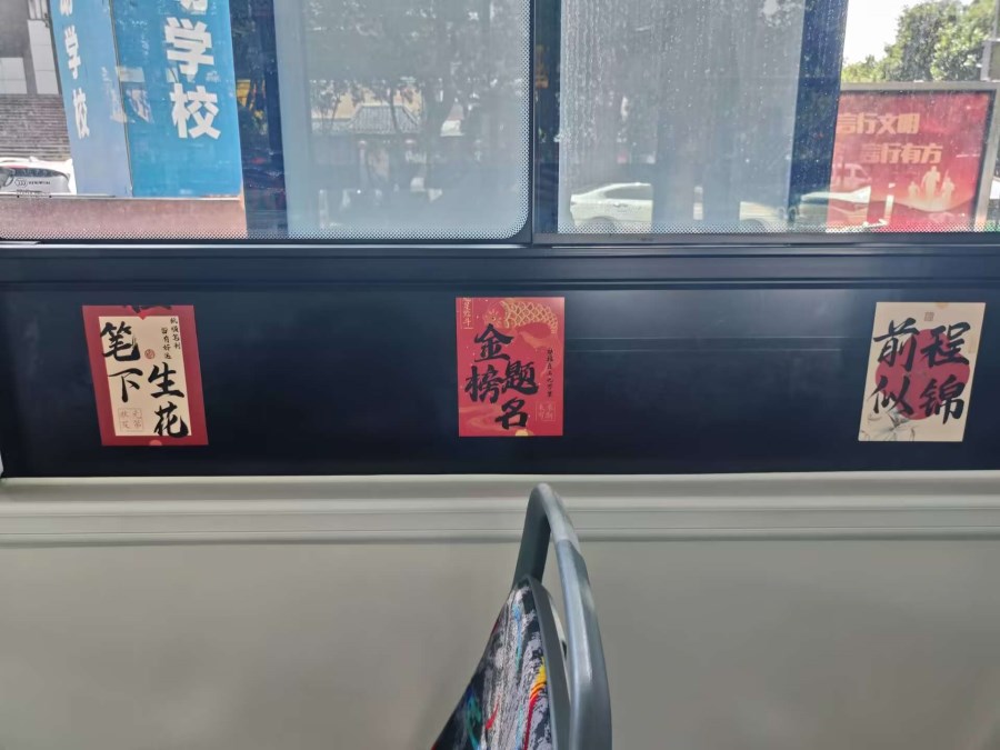 不僅如此,祝福貼紙也貼滿了車廂的各個角落。這些貼紙上面寫滿了鼓勵的話語,“加油!你是最棒的!”“高考必勝!”“夢想就在前方,沖呀!”等字樣隨處可見。當(dāng)學(xué)生和家長們踏上這輛公交車,映入眼簾的便是這一片充滿正能量的景象,瞬間讓人感到信心倍增。