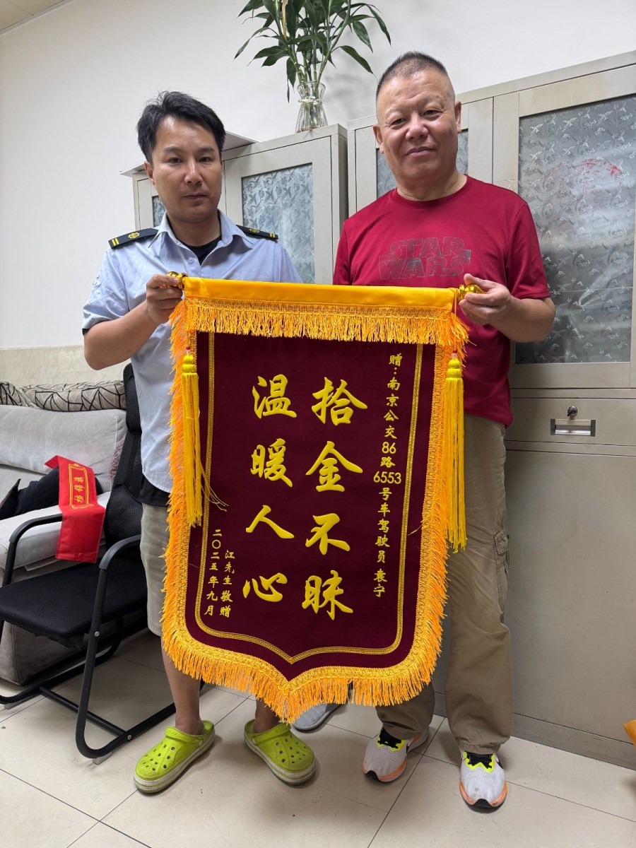 為了表達(dá)內(nèi)心的感激之情,江先生特地制作了一面錦旗送到86路車(chē)隊(duì)所在的匯景家園場(chǎng)站,親手將錦旗送到駕駛員袁寧以及車(chē)隊(duì)工作人員手中。江先生激動(dòng)地說(shuō):“這些證件對(duì)我太重要了,真的非常感謝你們,你們的善舉讓我感受到了溫暖?!痹瑢巹t表示:“這都是我應(yīng)該做的,每一位公交駕駛員遇到這種情況都會(huì)這么做,能幫到乘客我也很開(kāi)心?!?/p>