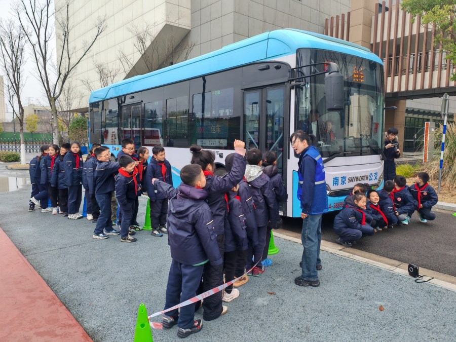 活動開始,公交志愿者周魁、竇星漢帶領(lǐng)同學(xué)們,現(xiàn)場演示講解了“什么是公交盲區(qū)”,選派“小體驗官”逐個上車觀摩體驗正常駕駛視角,切身體會大型車輛盲區(qū)的實際危險。此外,公交志愿者們還向大家介紹并演示了安全錘、滅火器等應(yīng)急安全設(shè)施的使用方法,指導(dǎo)他們?nèi)绾卧诰o急情況下的安全逃生。