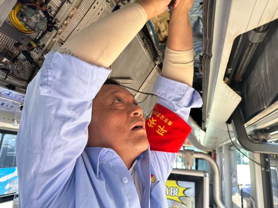 夏日的站頭,地面溫度常常高達(dá)五六十?dāng)z氏度。公交車剛停穩(wěn),發(fā)動機(jī)散發(fā)的余熱便與地面的高溫交織在一起,形成一個熾熱的“蒸籠”。但他沒有絲毫退縮,眼神專注地檢查著故障問題,不放過任何一個可能存在的隱患。