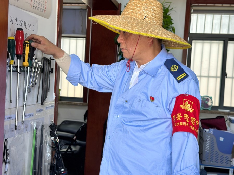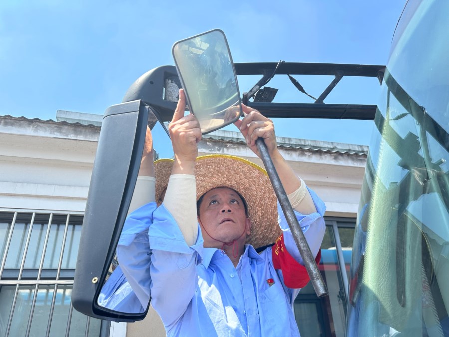 站頭,是他日常工作的“主戰(zhàn)場”。這里沒有涼爽的空調(diào)房,只有肆虐的熱浪和刺眼的陽光。當(dāng)公交車緩緩駛?cè)胝绢^,駕駛員們因為車輛問題陸續(xù)找來,他便迅速行動起來,身著被汗水浸濕的工作服,頭戴遮陽草帽,手持各種維修工具,仿佛是一名無畏的戰(zhàn)士,投身于這場與高溫和故障的戰(zhàn)斗中。