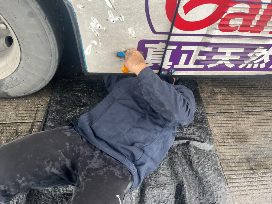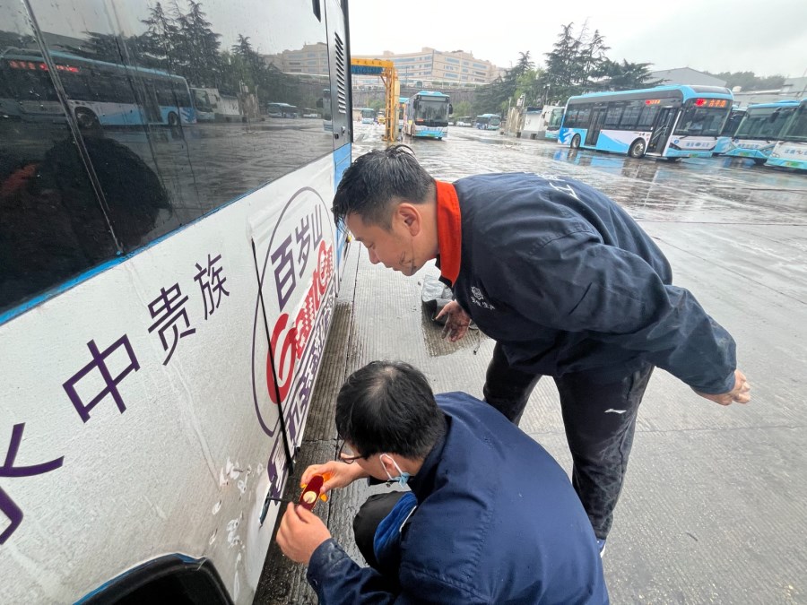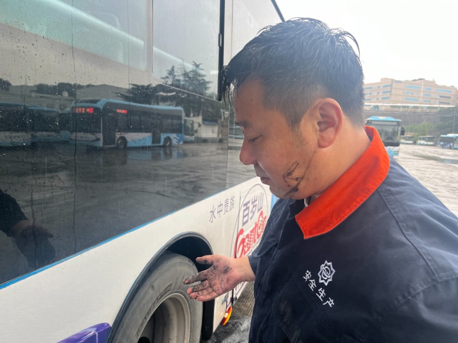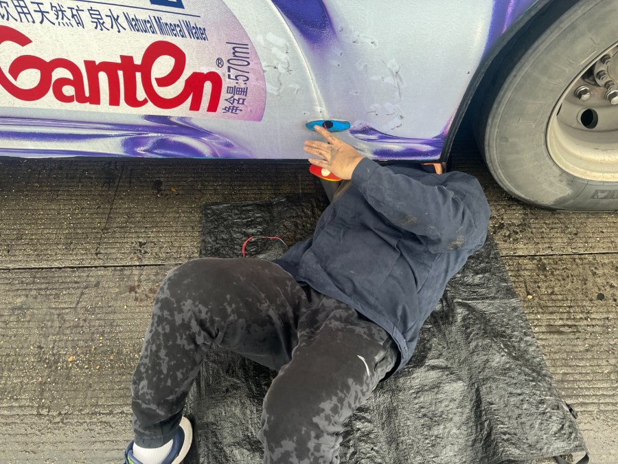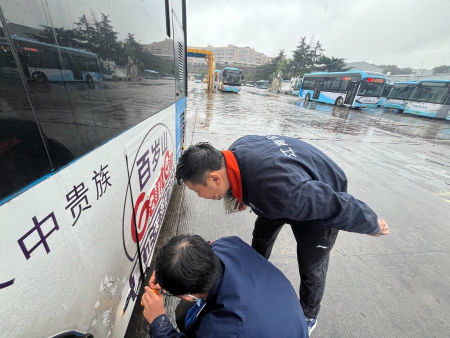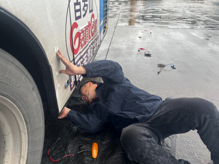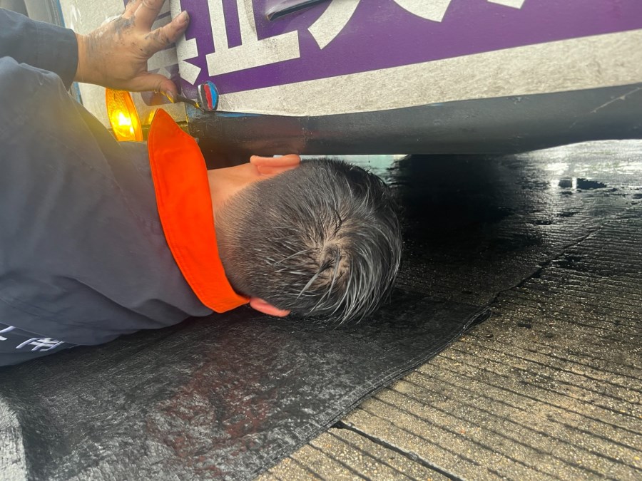 機電工陳銳,沒有絲毫猶豫,他提起工具,一頭扎進了滂沱大雨中。為了不耽誤駕駛員后續(xù)的年檢和運營時間,他爭分奪秒。場地積水嚴重,他順手找來一塊黑色塑料袋墊在濕漉漉的地上,隨即俯身,半個身子毅然探入了車底。