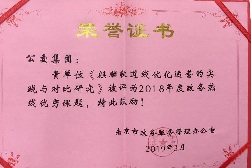 2019年6月28日,南京公交集團(tuán)捧回2018年度市12345政務(wù)熱線工作先進(jìn)單位獎(jiǎng)牌,《麒麟軌道線優(yōu)化運(yùn)營(yíng)的實(shí)踐與對(duì)比研究》榮獲了南京市政務(wù)辦唯一一個(gè)優(yōu)秀課題獎(jiǎng)。