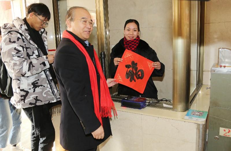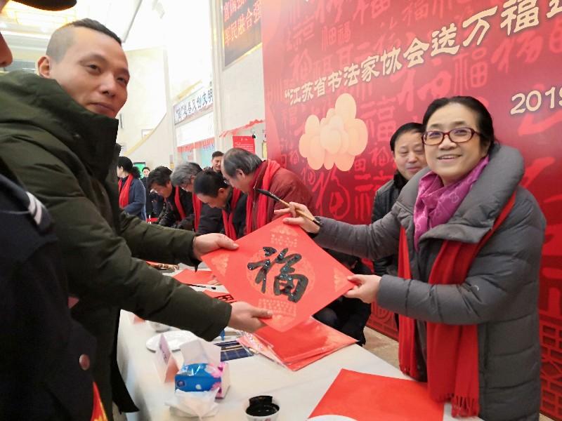 1月22日下午,由江蘇省文聯(lián)和南京公交集團(tuán)共同舉辦的“我們的中國夢 文化進(jìn)萬家—福至運(yùn)來 江蘇省書法家協(xié)會(huì)送萬福進(jìn)萬家”活動(dòng),在南京公交集團(tuán)輪渡公司中山碼頭候船大廳如期開展。江蘇省文聯(lián)黨組成員、書記處書記、副主席王健,中國書法家協(xié)會(huì)副主席、江蘇省書法家協(xié)會(huì)主席孫曉云帶領(lǐng)10名著名書法家現(xiàn)場為近300名南京公交集團(tuán)員工代表和乘客現(xiàn)場贈(zèng)送“福”字,并送上新春的祝福。公交集團(tuán)黨委書記曹玉莉、紀(jì)委書記胡宗杰、工會(huì)主席蘇鋒參加此次活動(dòng)?;顒?dòng)由公交集團(tuán)工會(huì)主席蘇鋒主持。