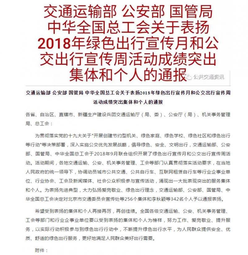 日前,交通運輸部、公安部、國管局、中華全國總工會對2018年綠色出行宣傳月和公交出行宣傳周活動中成績突出的256個先進(jìn)集體通報表揚,南京公交集團(tuán)名列其中!